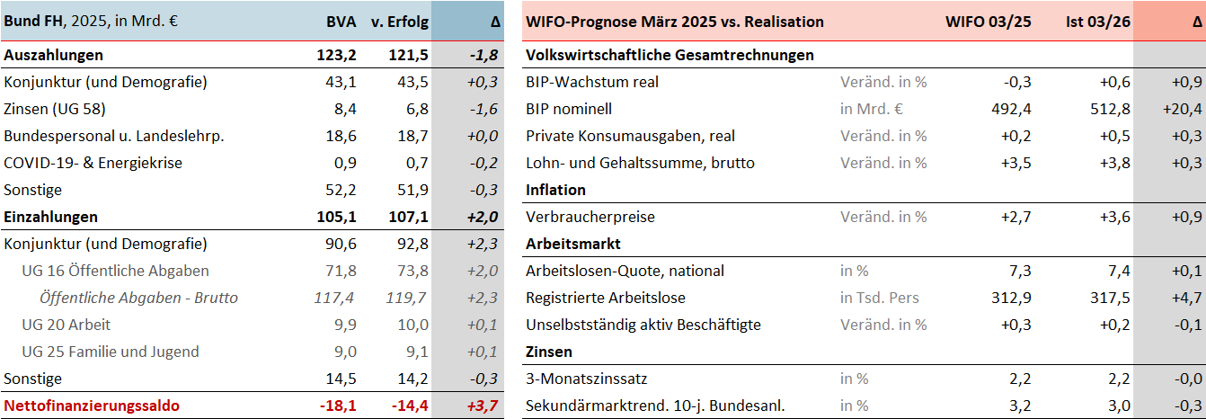 Das Konsolidierungsvolumen im Bundesbudget 2025 wurde vollständig erbracht. Durch strengen Budgetvollzug und bessere wirtschaftliche Rahmenbedingungen war der Finanzierungssaldo des Bundes 2025 mit -14,4 Mrd. € um 3,7 Mrd. € besser als zum Zeitpunkt der Budgeterstellung erwartet.